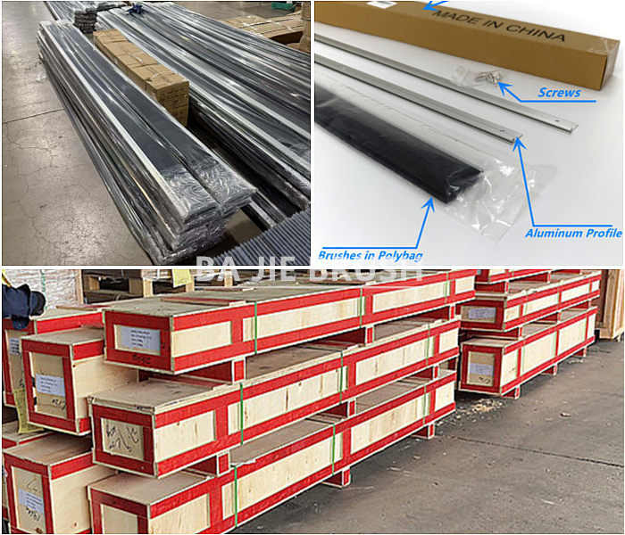 Dieser Bürstenstreifen besteht aus eine Metallrückseite Und flammhemmende NylonfasernBei der Montage wird die Bürstenleiste üblicherweise in eine Aluminiumhalterung eingesetzt, die eine sichere Befestigung am Türrahmen ermöglicht. füllt die kleinen Spalten zwischen Tür und Rahmen und sorgt so für eine effektive Abdichtung.