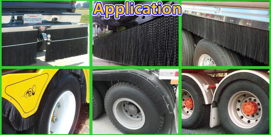 Truck mudguard spray suppressant flexible strip brush consists of rubber back and tufted polypropylene or nylon filament. It is installed on truck mudguard for dirt and water protection.